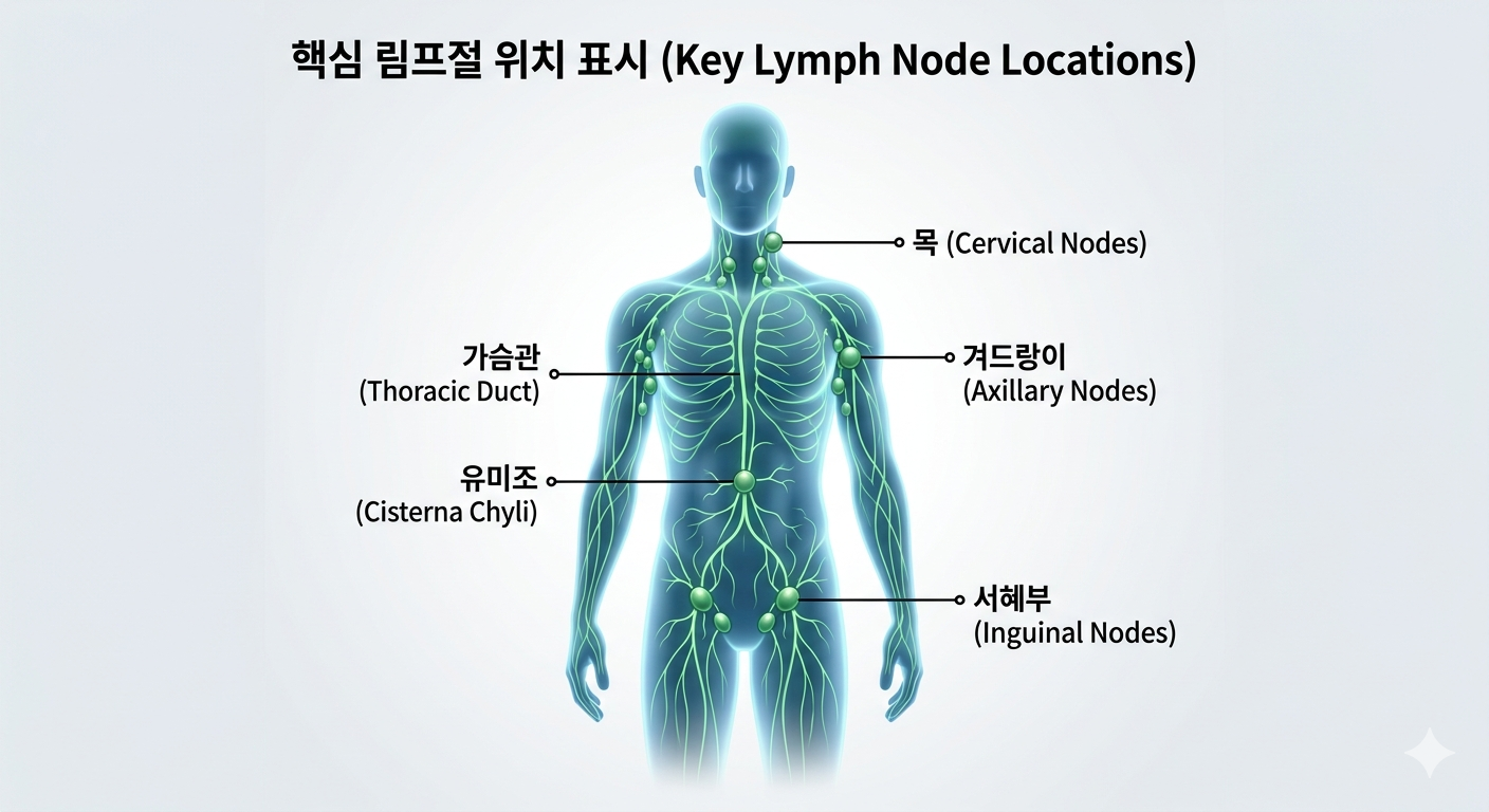 림프 마사지를 시작하기 전에 주요 림프절을 가볍게 자극하여 림프액이 잘 흐를 수 있도록 준비합니다. 림프절은 주로 목, 겨드랑이, 서혜부(사타구니) 등에 집중되어 있습니다 [1] [7] [8].